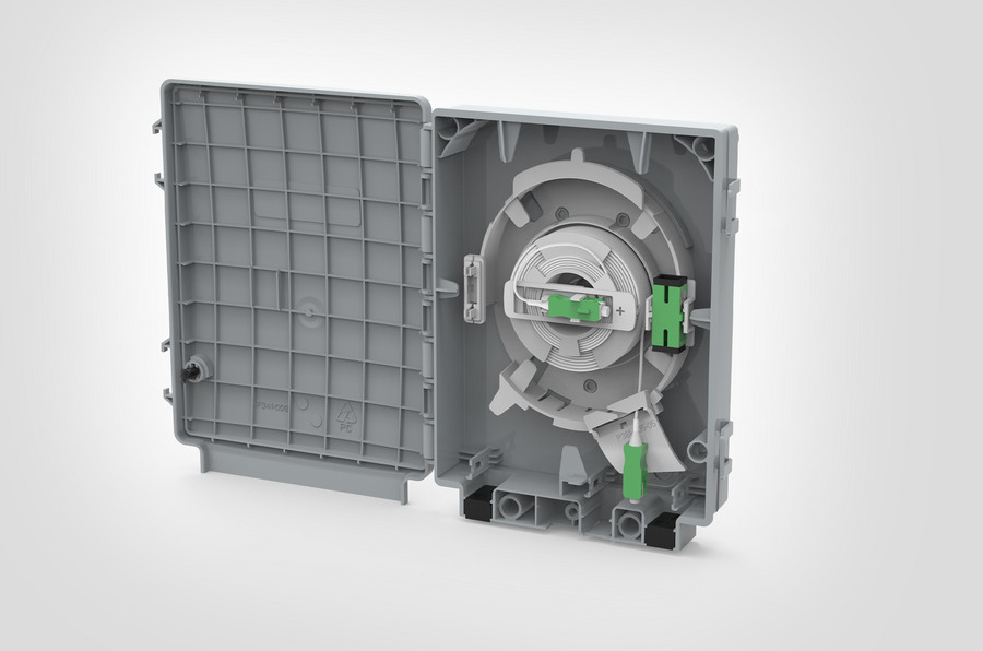 Die Connectorised Customer Wall Box (CCWB) bietet einen Glasfaseranschluss und einen Demarkationspunkt außerhalb des angeschlossenen Gebäudes und gleichzeitig die Flexibilität einer konfektionierten Lösung in einem Fibre-to-the-Home-Netzwerk (FTTH).